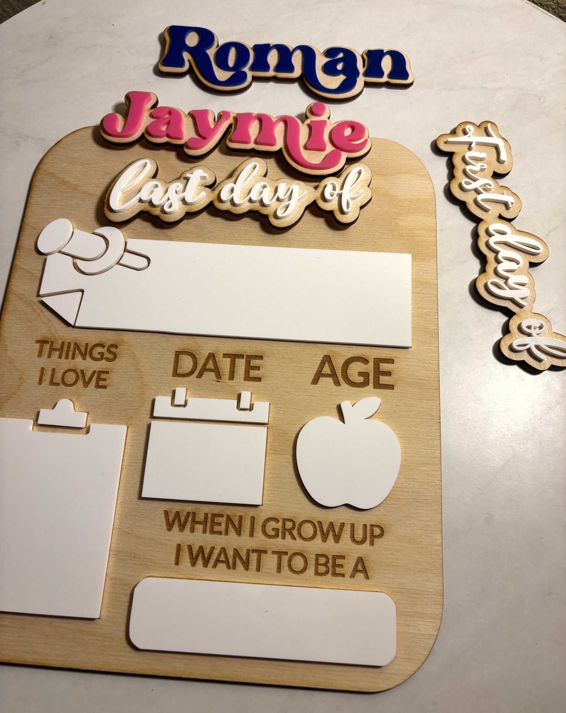 This Back to School Sign features interchangeable panels for "First Day" and "Last Day," allowing easy updates for each school year or interchangeable magnetic names as an add on for multiple siblings. Customize the sign with a variety of color options to suit your preferences or school theme. Designed for use with dry erase markers, it lets you add personalized notes, dates, or school year that can be quickly erased and changed. Durable and reusable, this sign is an expert choice for capturing memorable school moments with flexibility and style.
